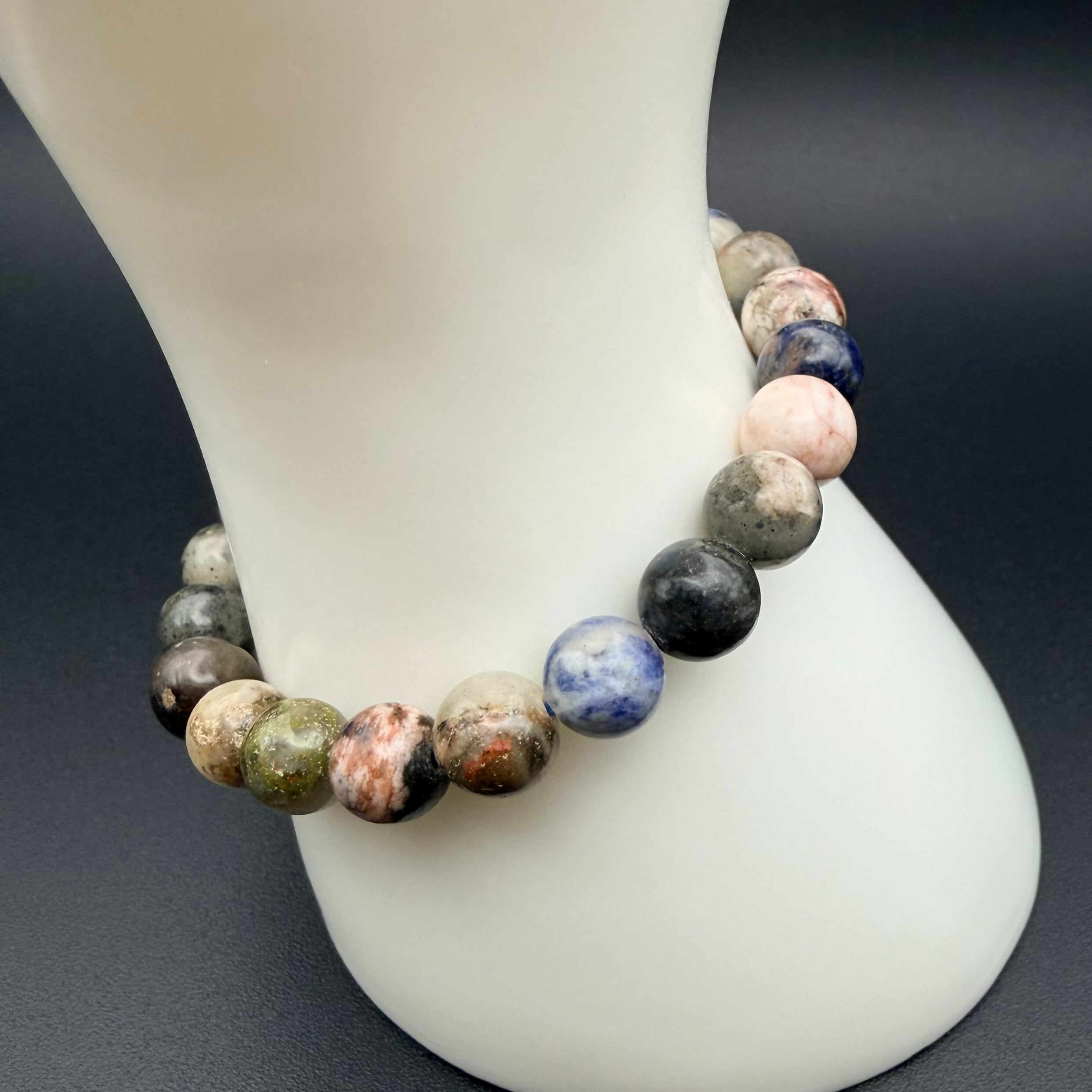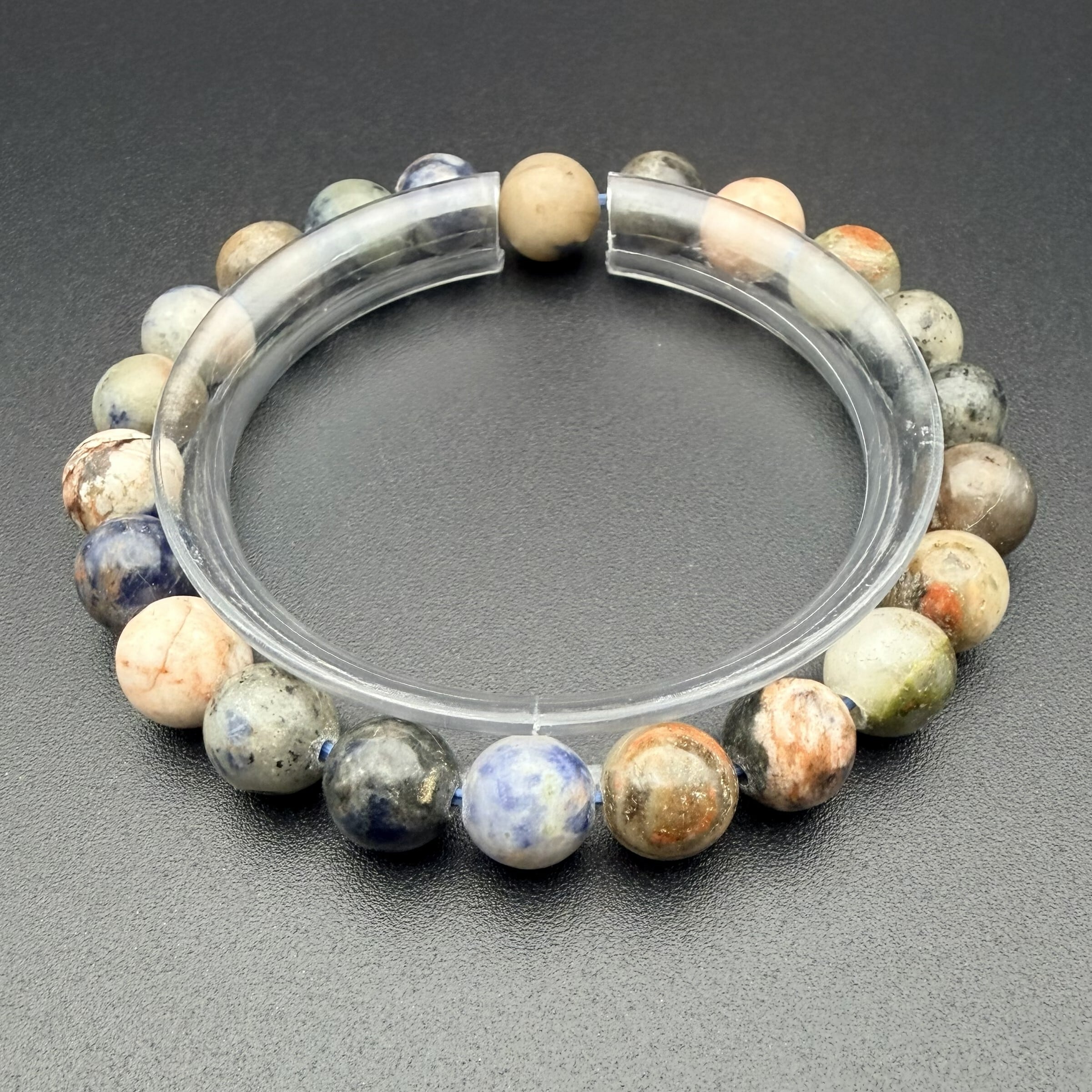 複数の鉱物が織りなす複雑な模様が魅力の天然ソーダライトネフェリンサイエナイトのブレスレットです。