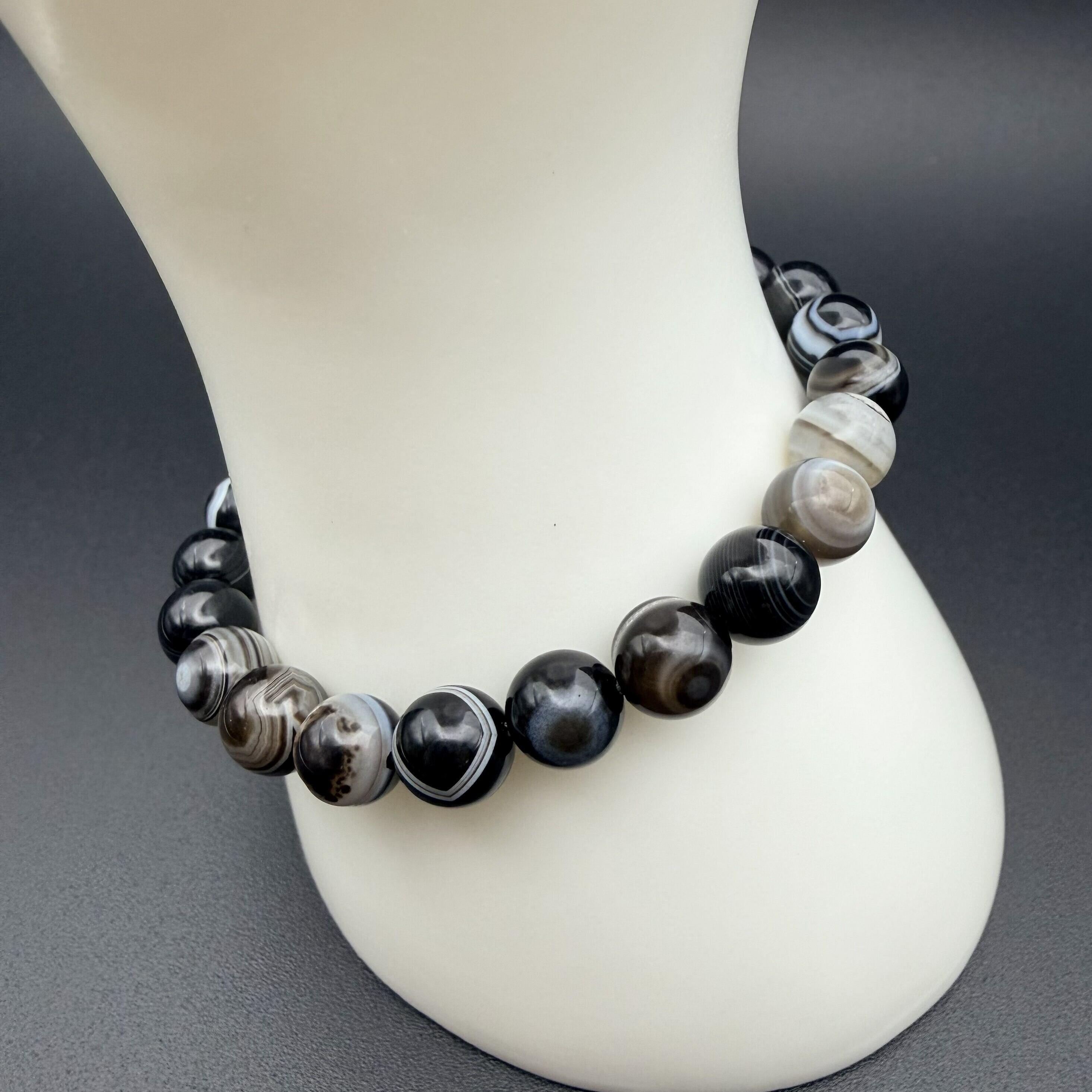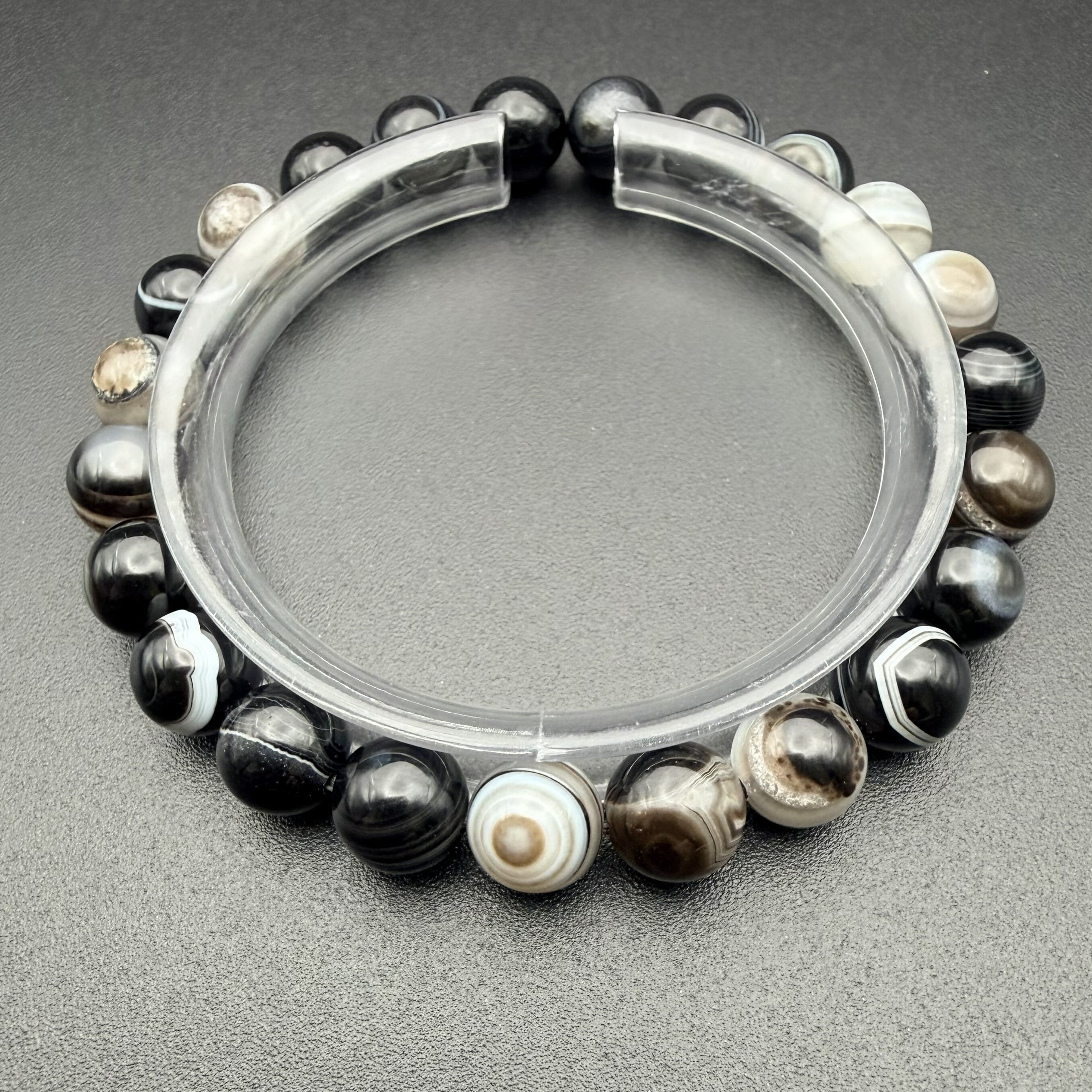まるで見守られているような、力強い「目」の模様が特徴の天然**天眼石(アイアゲート)**のブレスレットです。天眼石は、深い黒色と独特の模様が特徴の天然石で、持つ人に安定感と洞察力をもたらす特別なアイテムです。このブレスレットは、身に着けることで心を落ち着け、内面の強さを引き出してくれる素敵なアイテムです。