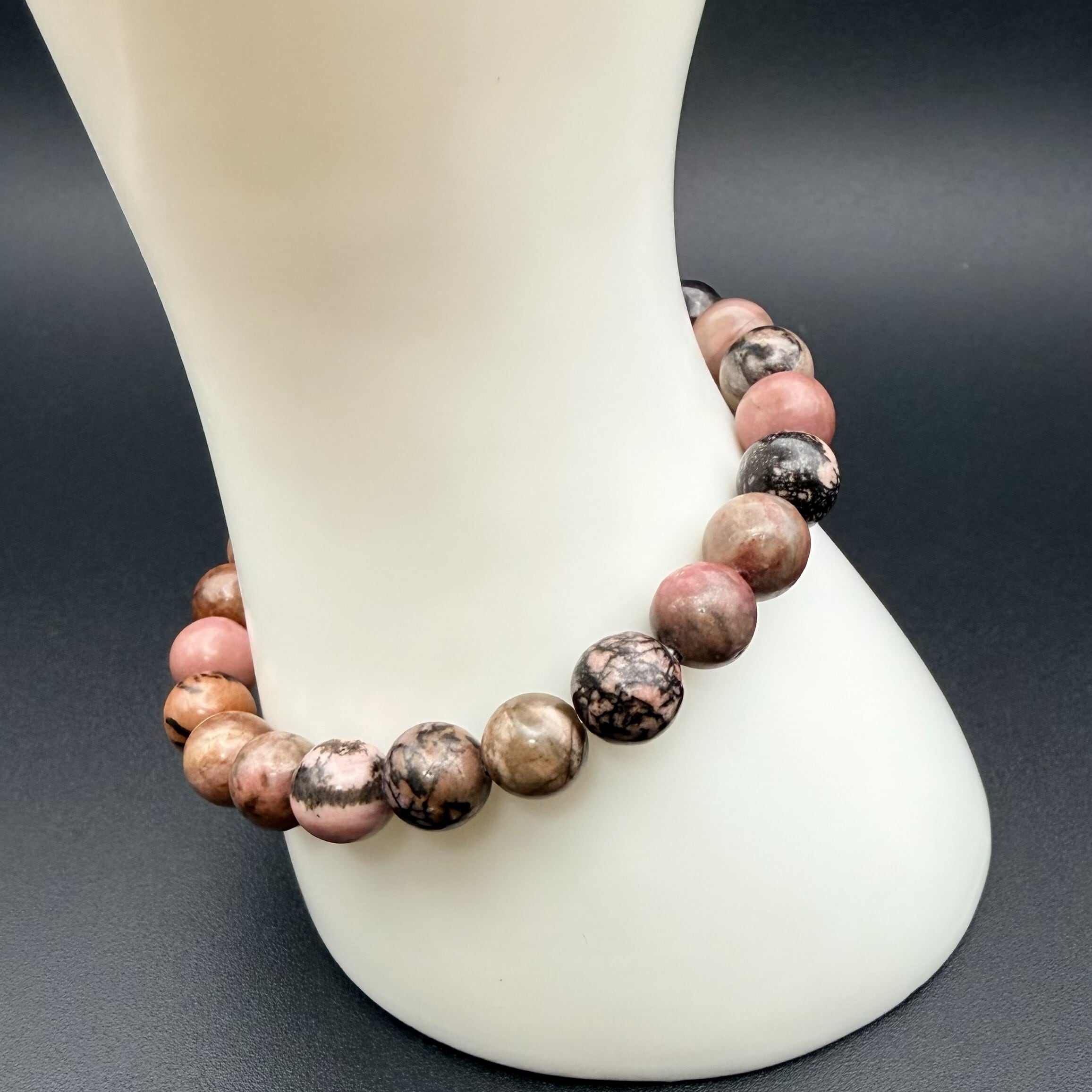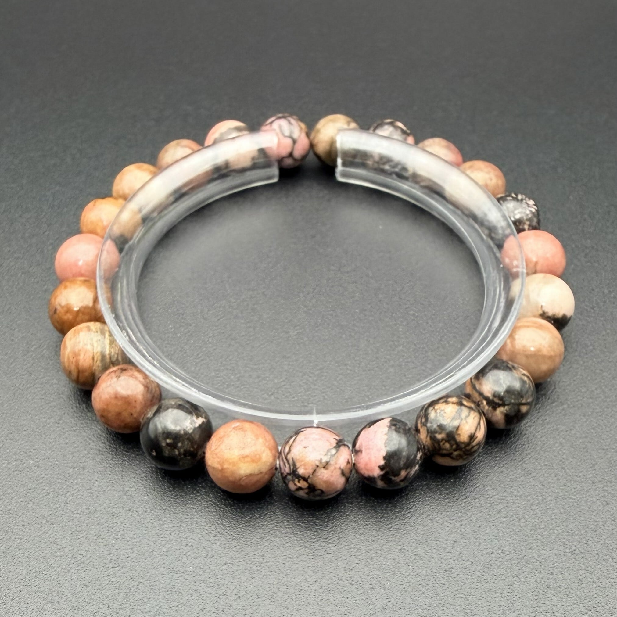 ロードナイト特有の、深く温かみのあるピンク色に黒い模様が混じり合った、力強くもどこか懐かしい質感が魅力です。一粒ごとに異なる天然石ならではの豊かな表情を楽しむことができ、手元に大人っぽく知的な華やかさを添えてくれます。