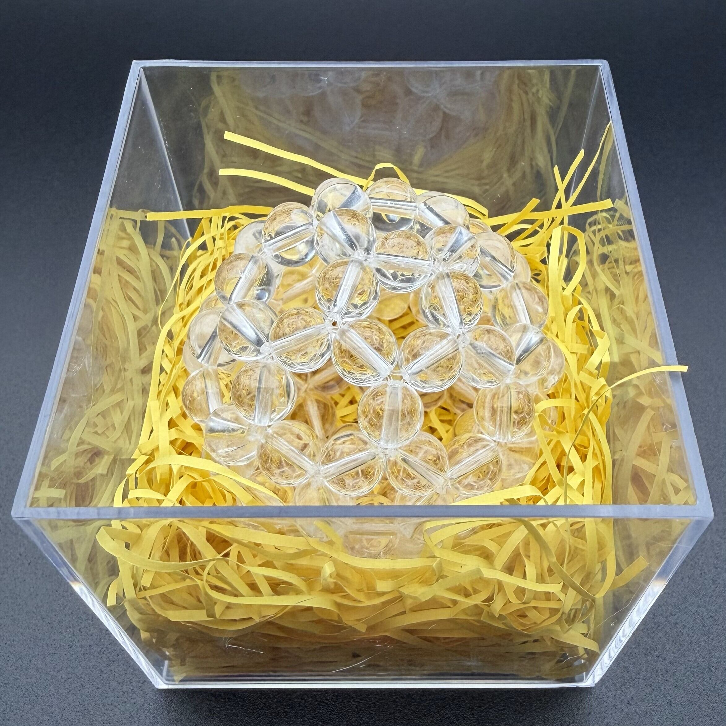 美しい天然水晶AAAを使用したこの8mm玉は、フラーレンクリエーターによる天然石の穴にあわせてテグスの太さを調整した丁寧な制作をしており、柔らかくなりがちなフラーレンを極限まで硬く制作しております。フラーレンの効果により情緒を安定させ、多様なエネルギーを持つ特別なアイテムです。神聖幾何学フラーレンは、持つ人に意識の拡張と深い内面の洞察をもたらします。