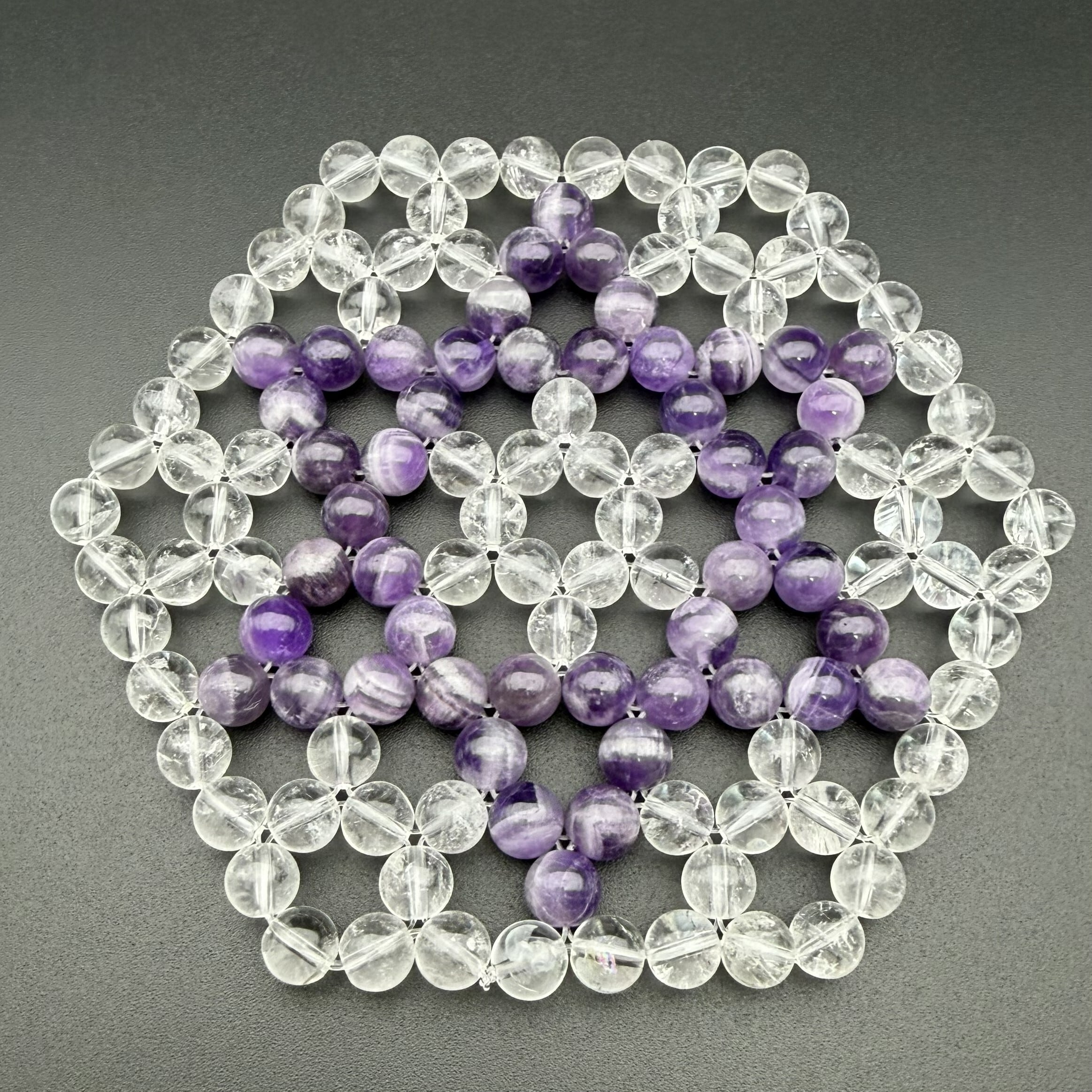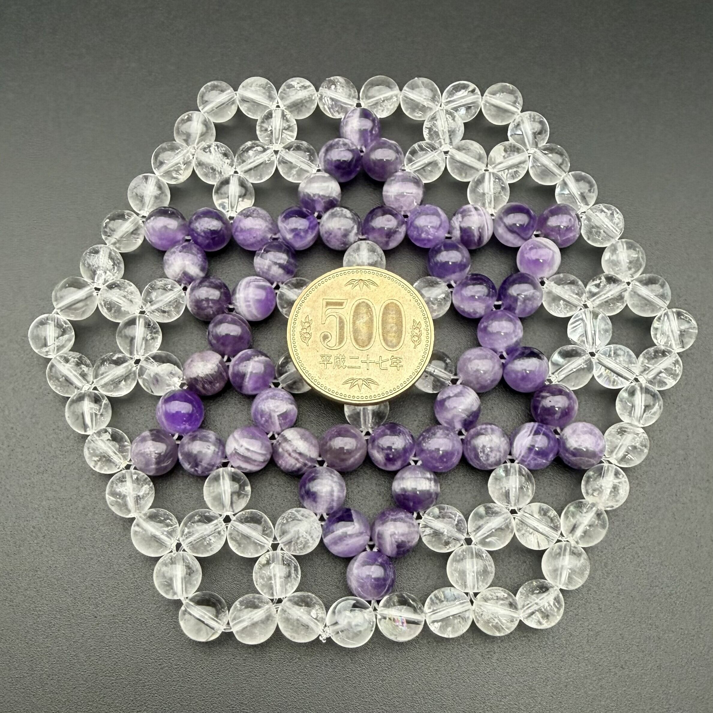 使用ストーン: 水晶8mm×84玉、シェブロンアメジスト8mm×48玉