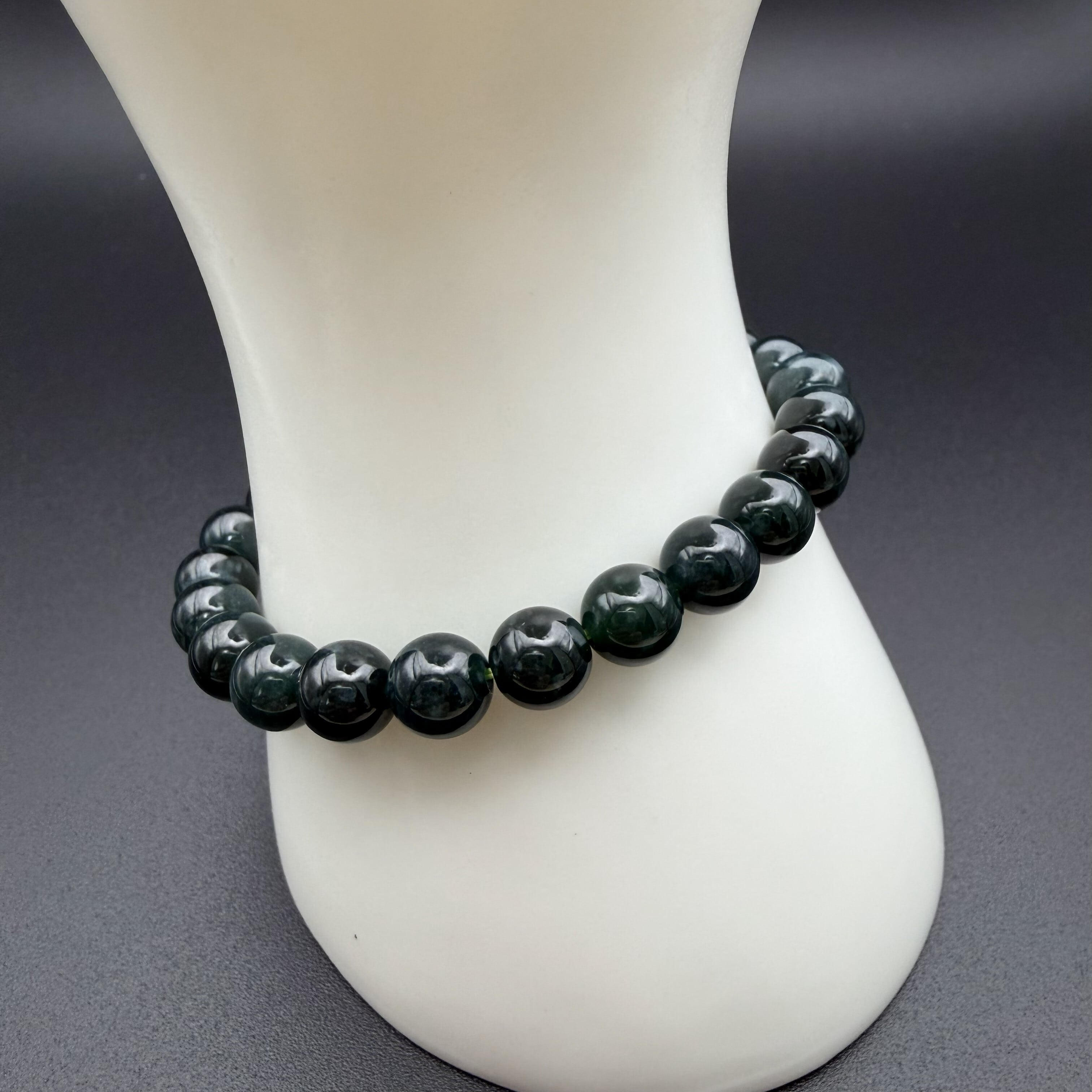 【希少・高品質 グアテマラ産本翡翠】 深みのあるダークグリーンが美しい、グアテマラ産の本翡翠(ジェダイト)ブレスレットです。 グアテマラ翡翠特有の、吸い込まれるような濃い色彩と艶やかな光沢が特徴のハイグレードなお品です。