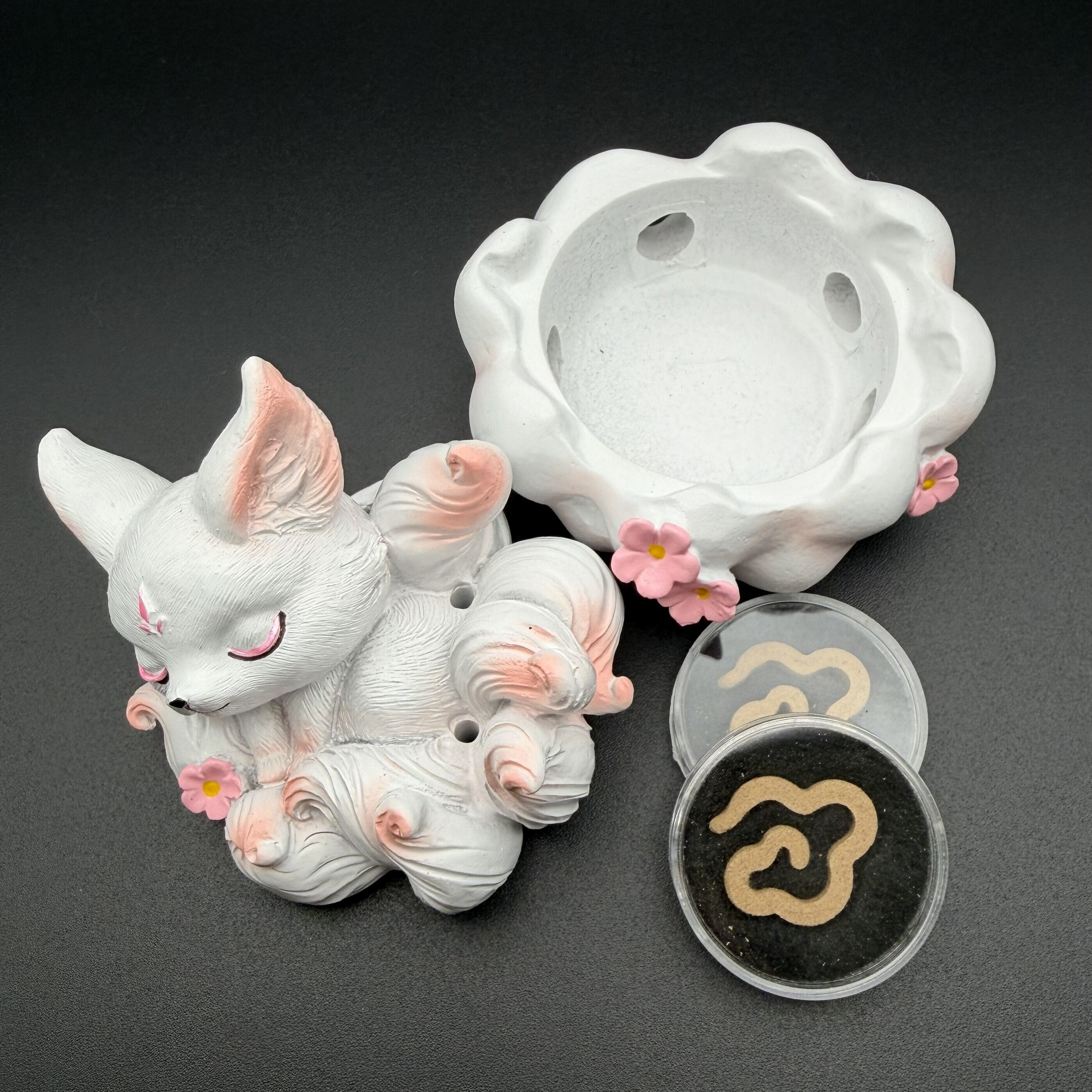 繊細な造形と、淡いピンクの桜が彩る上品な仕上がり。お香を焚くと、幻想的な煙の動きが九尾の神聖さを引き立てます。