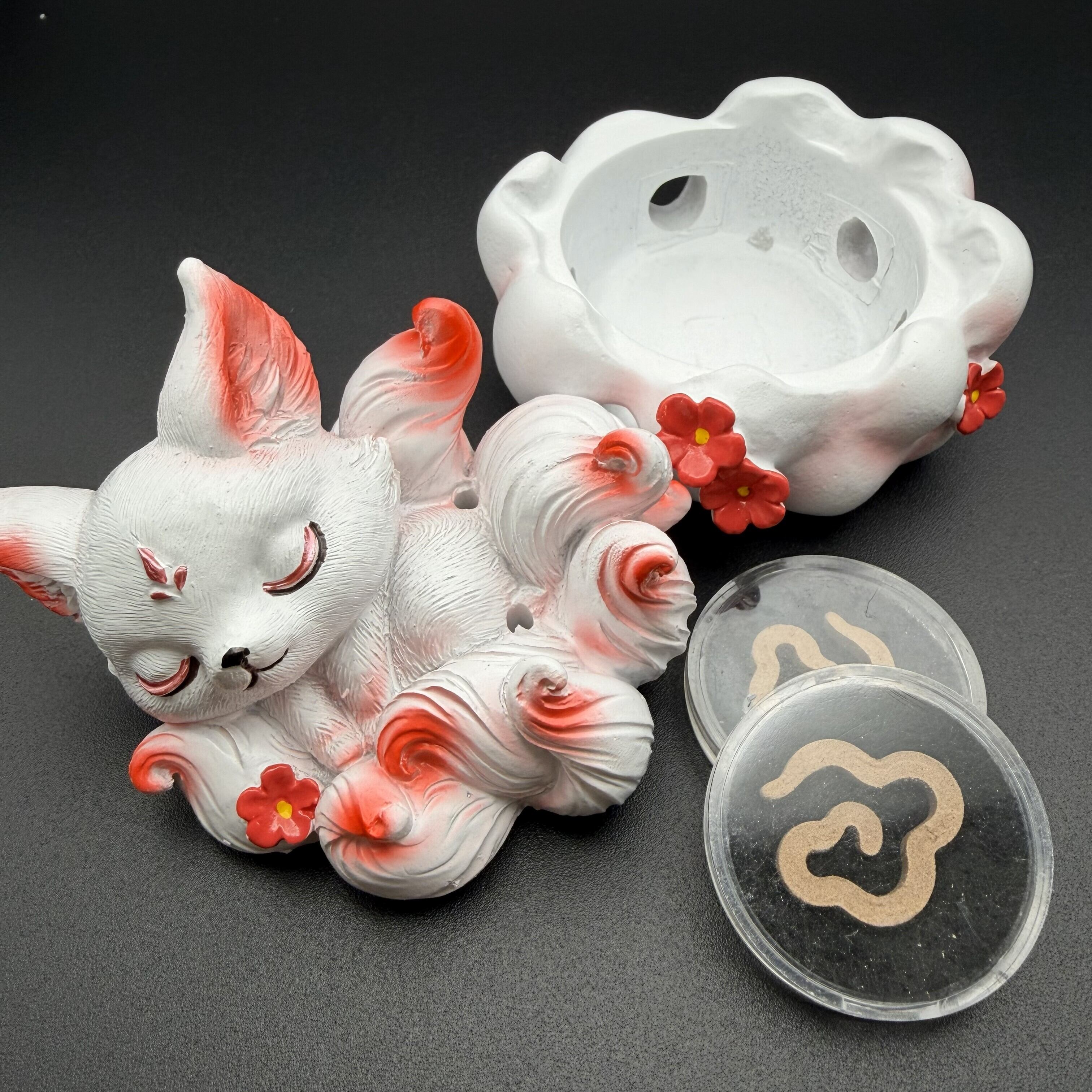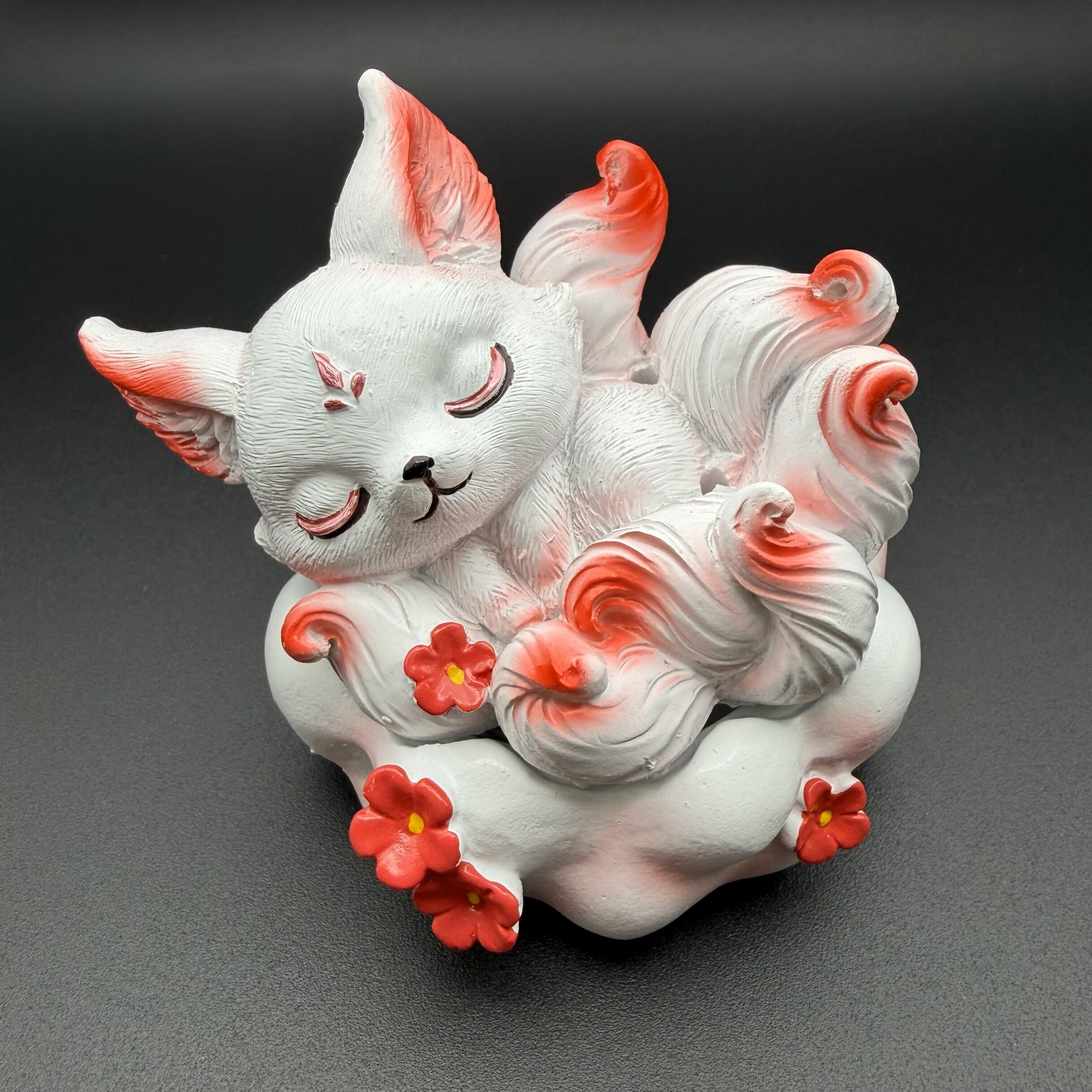 繊細な造形と、綺麗な赤色が彩る上品な仕上がり。お香を焚くと、幻想的な煙の動きが九尾の神聖さを引き立てます。