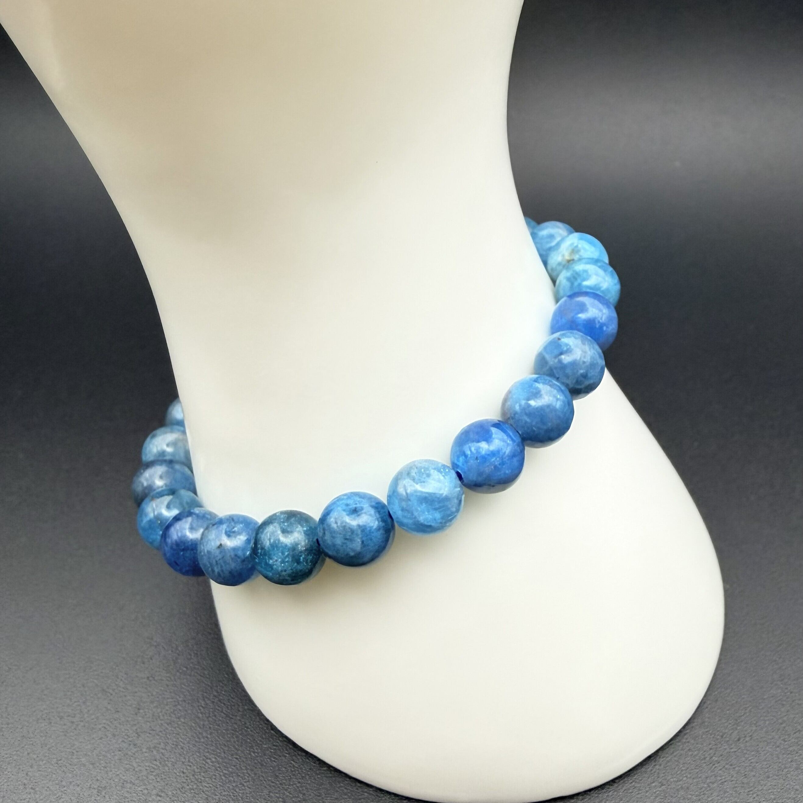 ブルーアパタイトは、鮮やかな青色が特徴の天然石で、持つ人に創造力とインスピレーションを与える特別なアイテムです。このブレスレットは、身に着けることで心のクリアさとエネルギーを高めてくれる素敵なアイテムです。