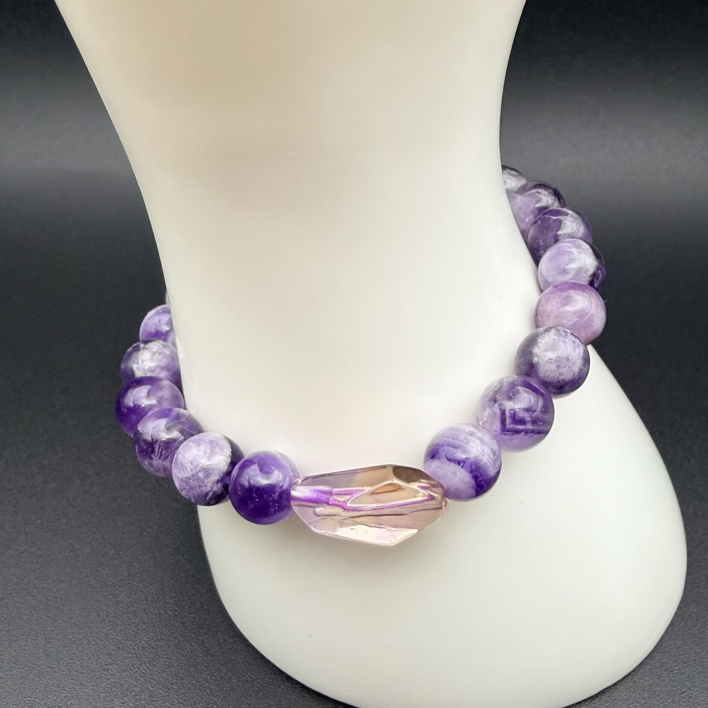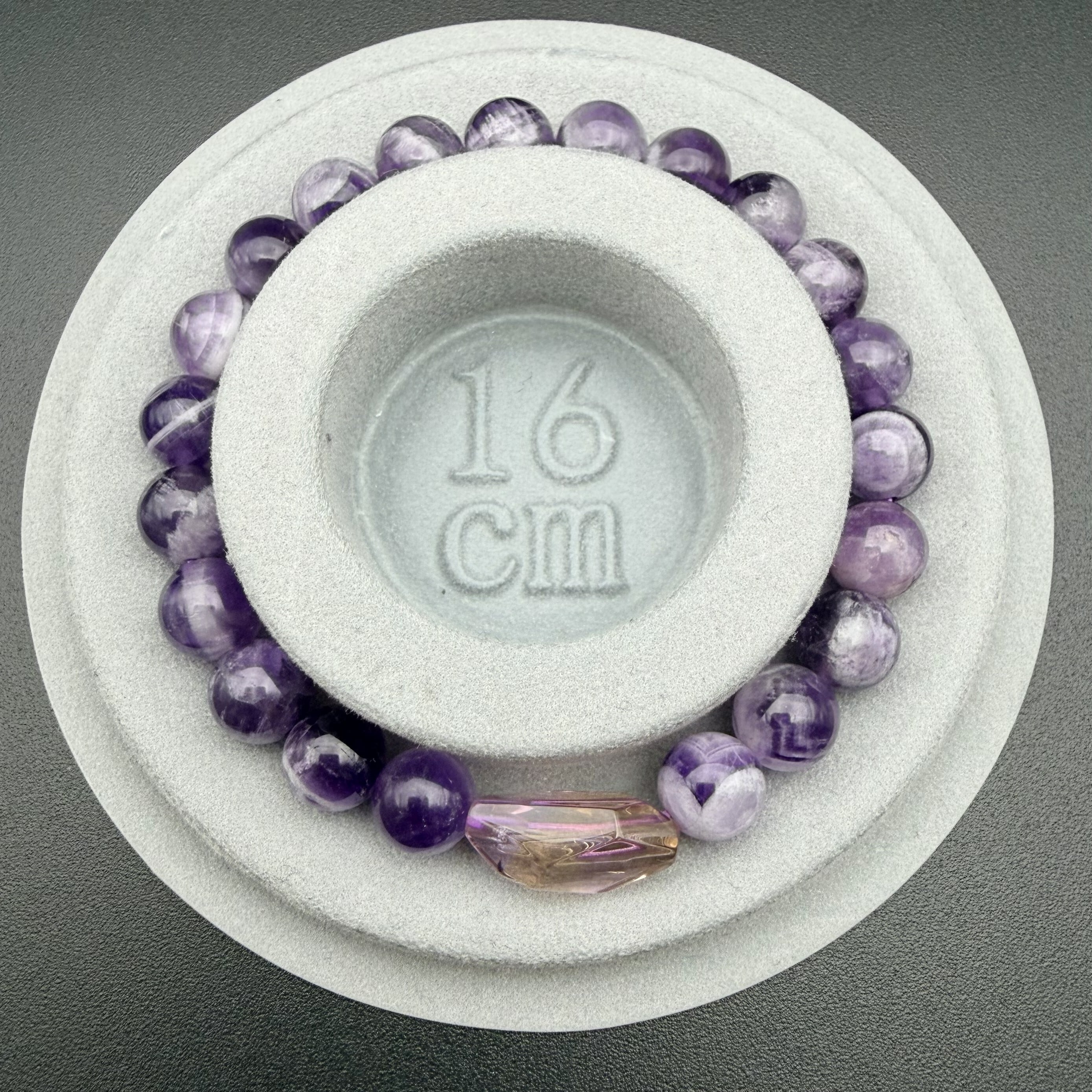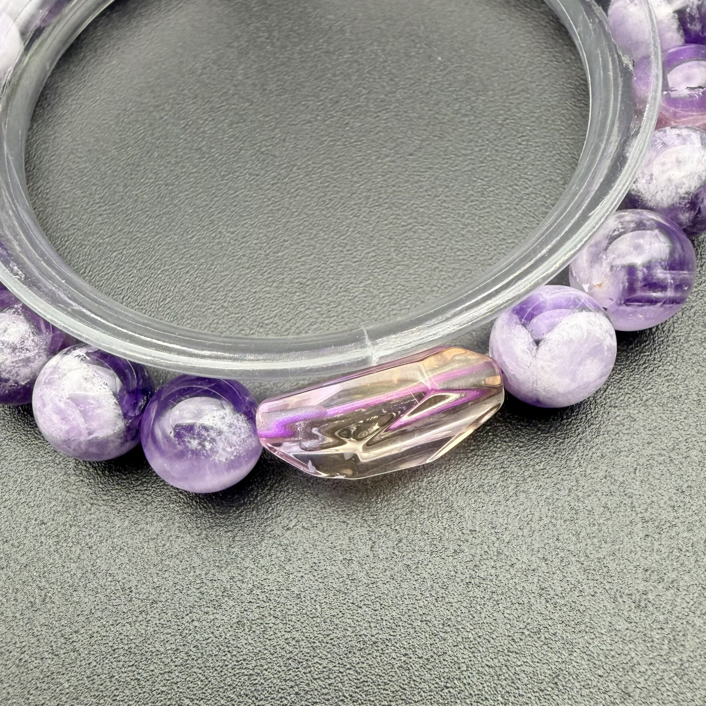 独特の「V字模様」が美しいシェブロンアメジスト(ケープアメジスト)と、バイカラーの輝きを放つアメトリンを組み合わせた、神秘的なデザインブレスレットです。