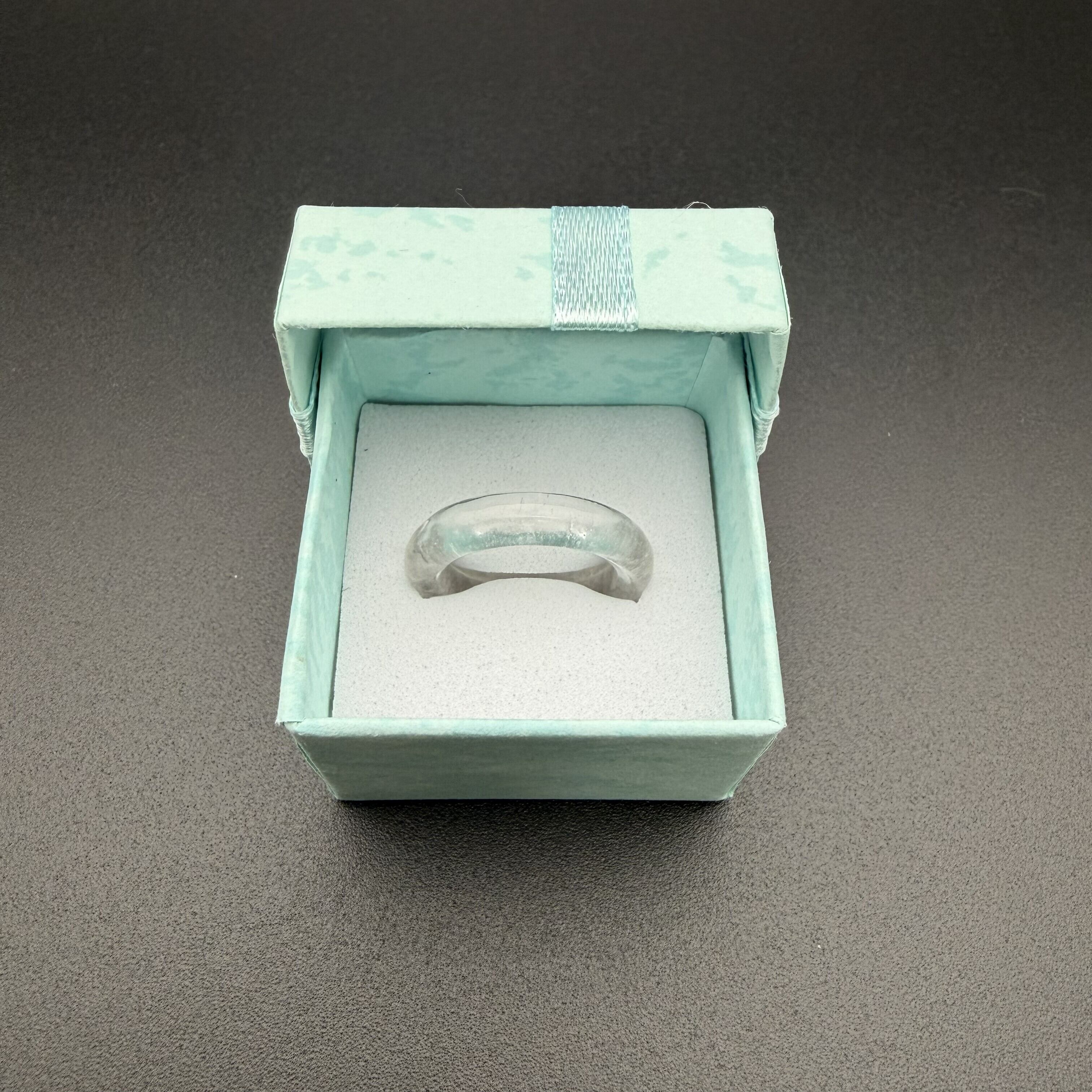 幅約4.7mm、厚み約3.5mmと、程よい存在感があります。透明な水晶は肌を透かし、手元に瑞々しさと清潔感を与えてくれます。他のリングとの重ね付けや、ペンダントトップとしてチェーンに通していただくのも素敵です。