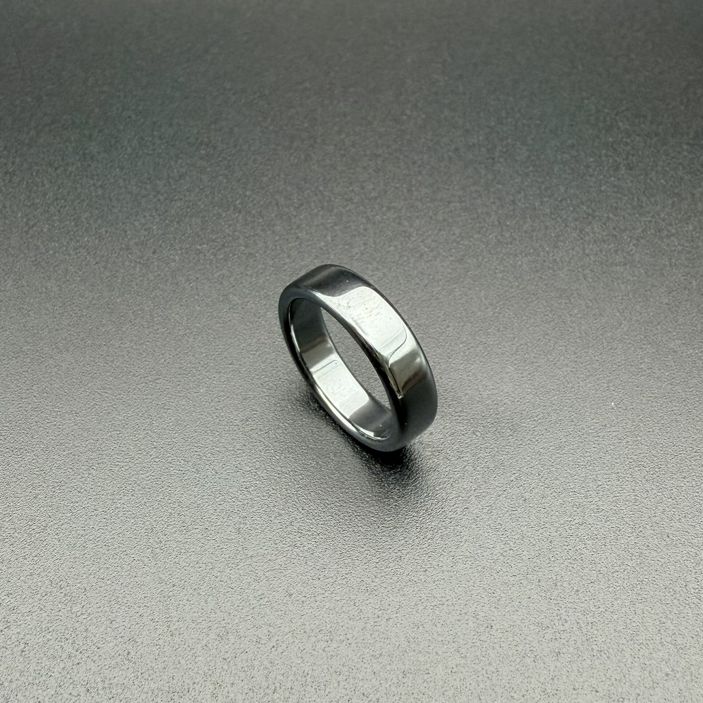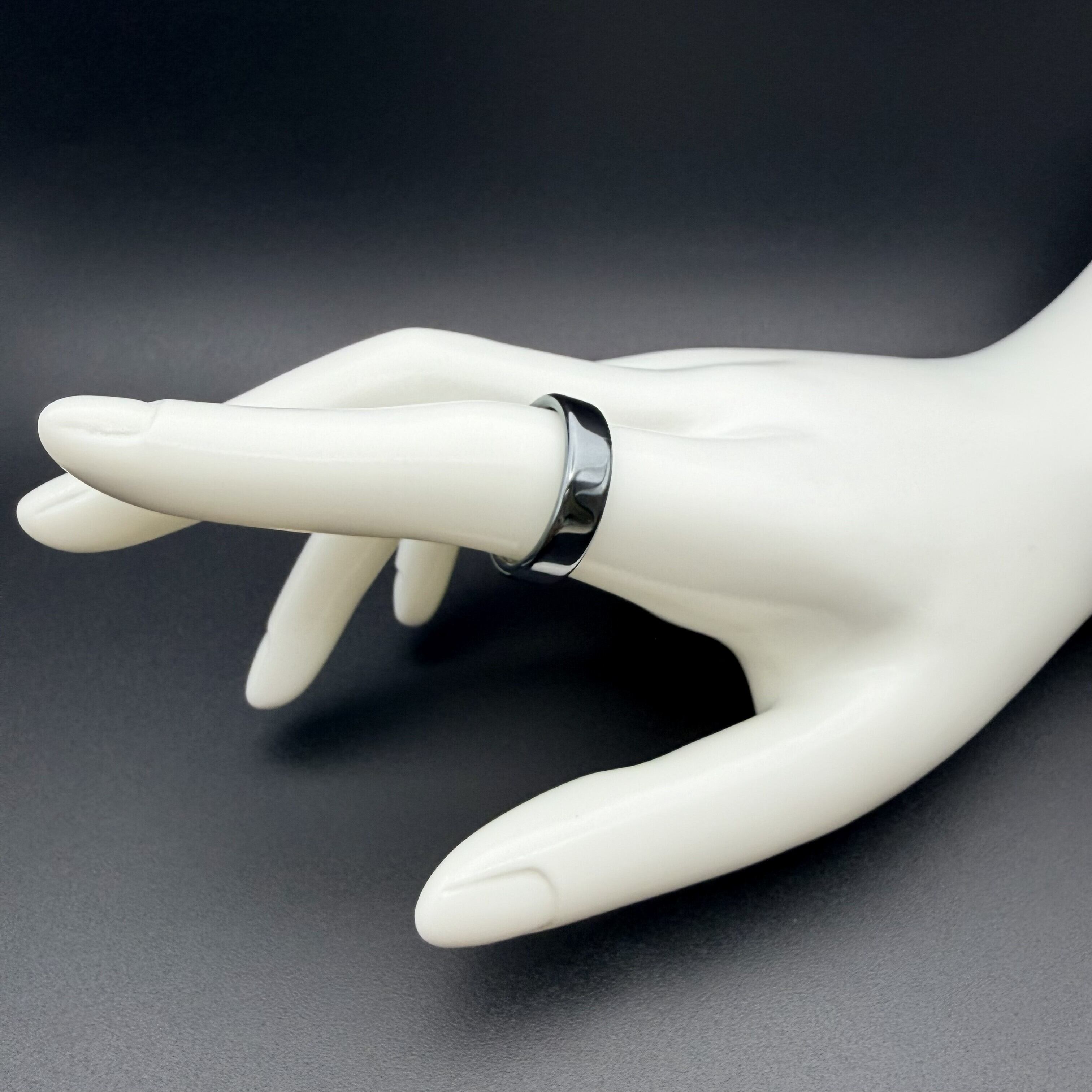 メタリックな輝きを持つヘマタイトに、上品なシルバーカラーが施されており、一見するとシルバーリングのような重厚感があります。しかし、石特有の滑らかな指通りと、ひんやりとした質感が楽しめるのは「くりぬきリング」ならではの魅力です。
