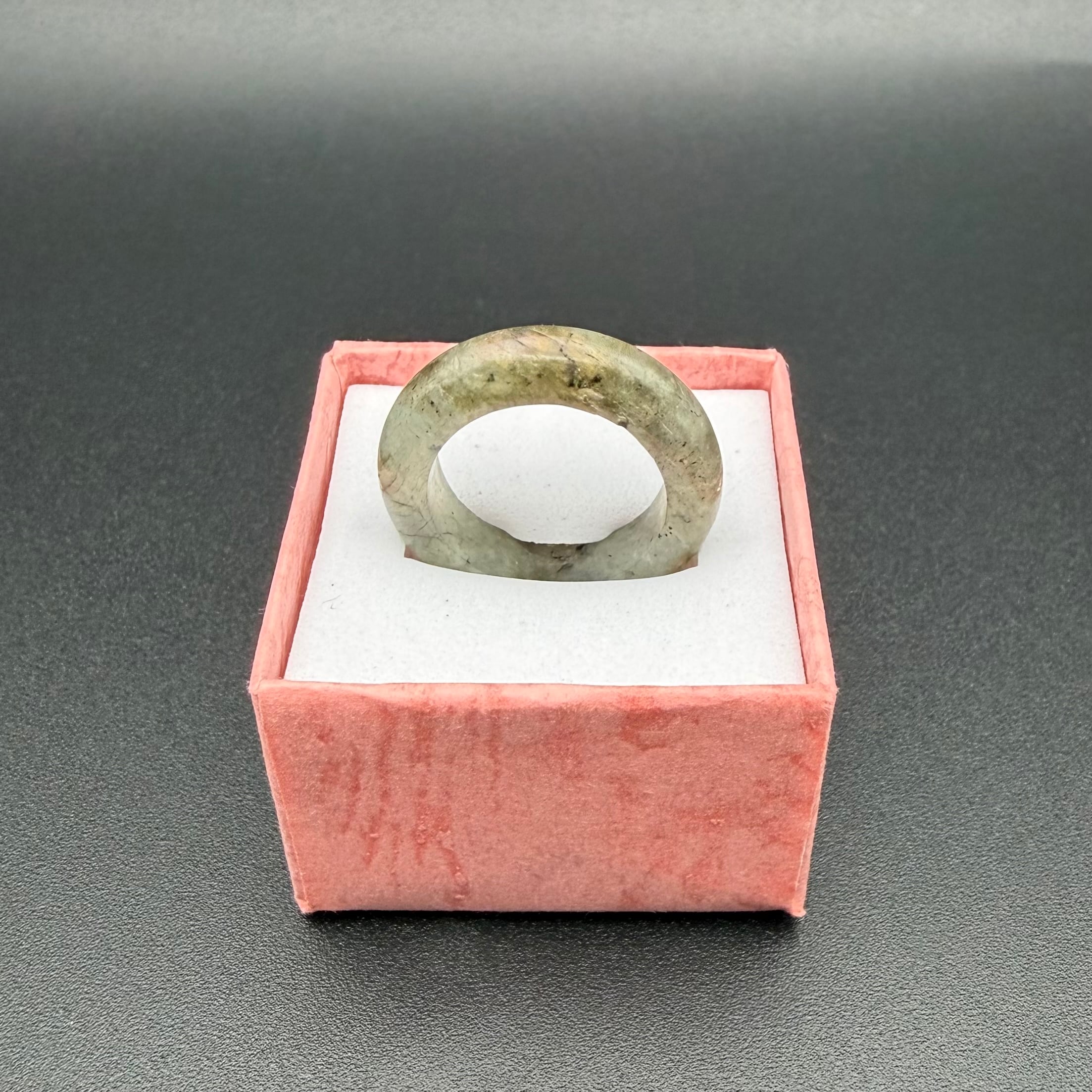 一見すると落ち着いたグレーですが、光の角度によってオーロラのような幻想的な輝きを放つ、天然石**「ラブラドライト」**のくりぬきリングです。