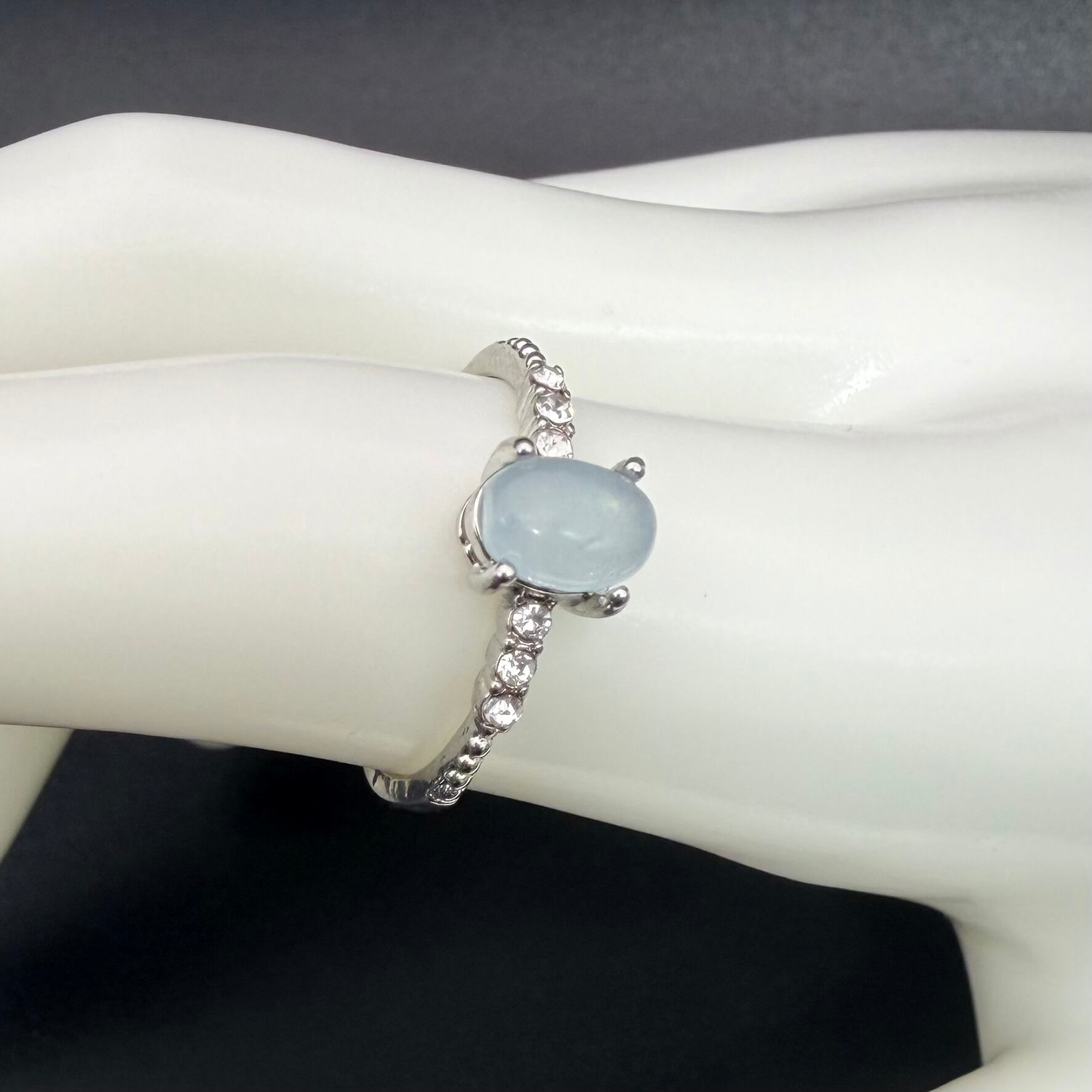 優しいミルキーブルー: 約0.75ctのオーバル・カボションカット。肌を白く美しく見せてくれる、優しく柔らかなブルーの色合いが魅力です。