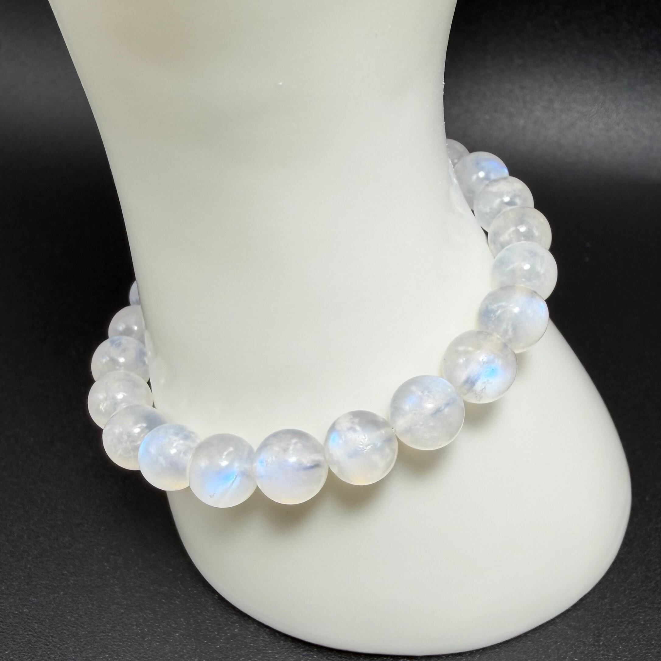 透明感のある乳白色の中に、幻想的な青い輝き(レブラドレッセンス)が浮かび上がる、高品質なブルームーンストーンのブレスレットです。