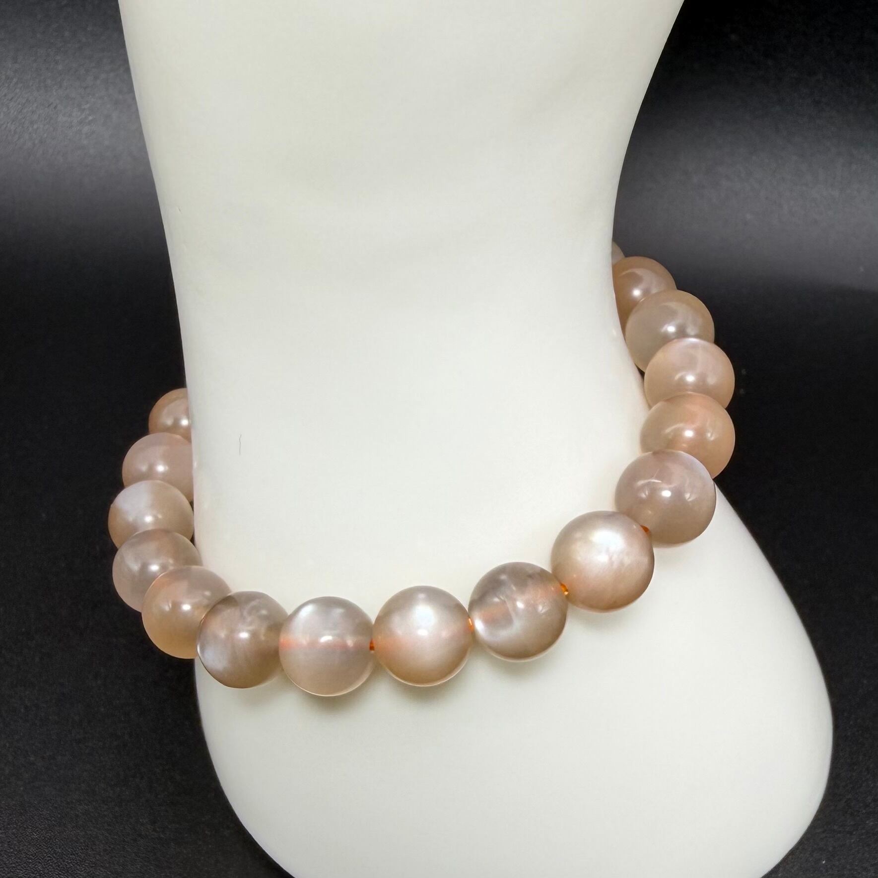 一般的なムーンストーンよりも、とろけるようなミルキーな色合いが特徴で、光が当たると石の表面に「シラー」と呼ばれる月光のような淡い輝きがふんわりと浮かび上がります。